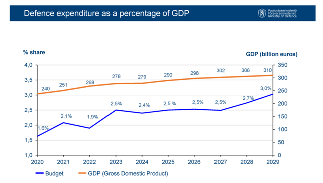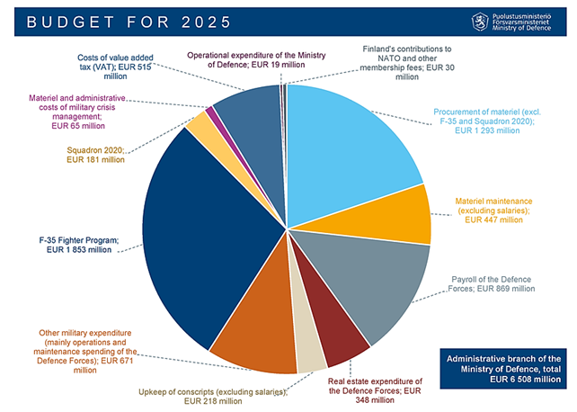 The Ministry of Defence is responsible for managing the country’s defence resources and operating conditions. The Ministry of Defence’s budget for 2025 is approximately EUR 6.5 billion. Finland has set a goal to increase defence spending to at least 3 % of its gross domestic product (GDP) by 2029.
