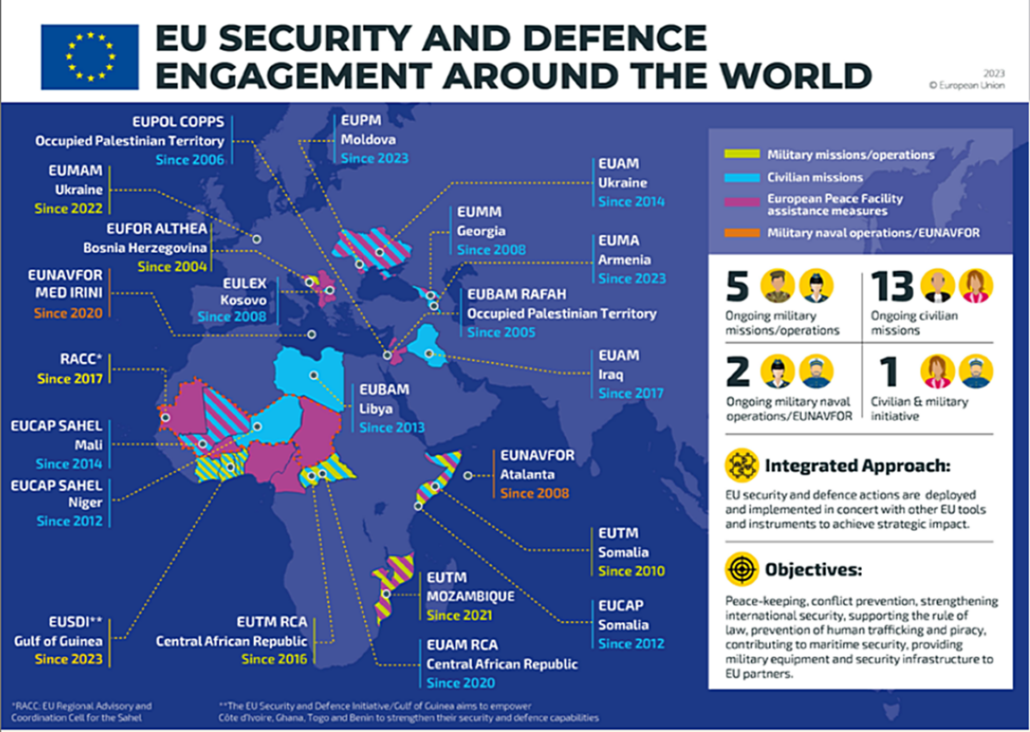 EU:n kriisinhallintaoperaatiot 2023. Kuvalähde: https://www.eeas.europa.eu/sites/default/files/documents/2025/EEAS-CSDP-AnnualReport-02.pdf.