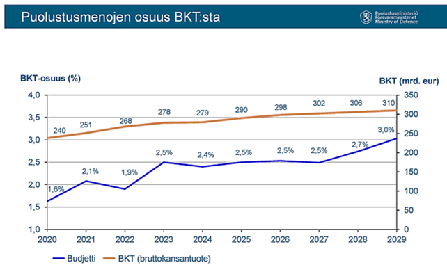 Budjetti kuvaa suoranaisiin puolustustarkoituksiin vuosittain myönnettyä määrärahaa. Puolustusmenot lasketaan Naton puolustusmenomääritelmän mukaisesti niin, että puolustusbudjetin lisäksi otetaan huomioon puolustushallinnon eläkemenot, ulkoministeriön osuus sotilaallisen kriisinhallinnan menoista sekä osa Rajavartiolaitoksen menoista. Oheisessa kaaviossa on esitetty puolustusmenojen BKT-osuuden kehittyminen vuodesta 2020 lähtien sekä en ennuste vuoteen 2029 saakka. BKT-tiedot perustuvat valtiovarainministeriön tietoihin.