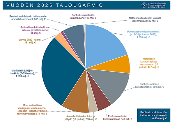 Vuoden 2025 puolustusbudjetti jakautuu erilaisiin käyttötarkoituksiin oheisen kaavion mukaisesti.