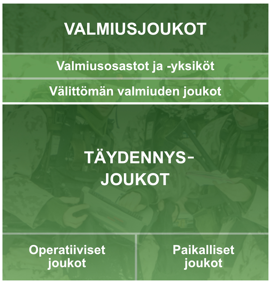 - Välittömän valmiuden joukot: pidäkkeen luomiseksi sotilaallisen voiman käytölle Suomea vastaan, voidaan aloittaa taistelutehtävien toteuttaminen.