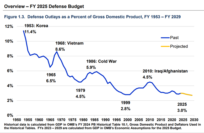 Yhdysvaltojen puolustusmenot 1950–2030. Kuvalähde FY2025_Budget_Request_Overview_Book.pdf