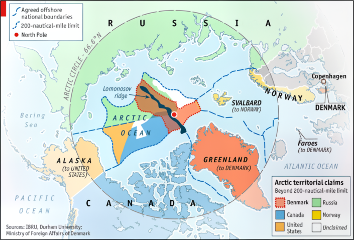 Territoriella anspråk för kuststaterna i Norra ishavet i den arktiska regionen. Bildkälla: Dal, Adnan: Introducing Territorial Disputes in the Arctic (2023).