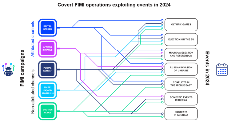 Salaiset informaatiovaikuttamisoperaatiot, joissa hyödynnettiin erilaisia tapahtumia vuonna 2024. Kuvalähde: 3rd EEAS Report on Foreign Information Manipulation and Interference Threats.